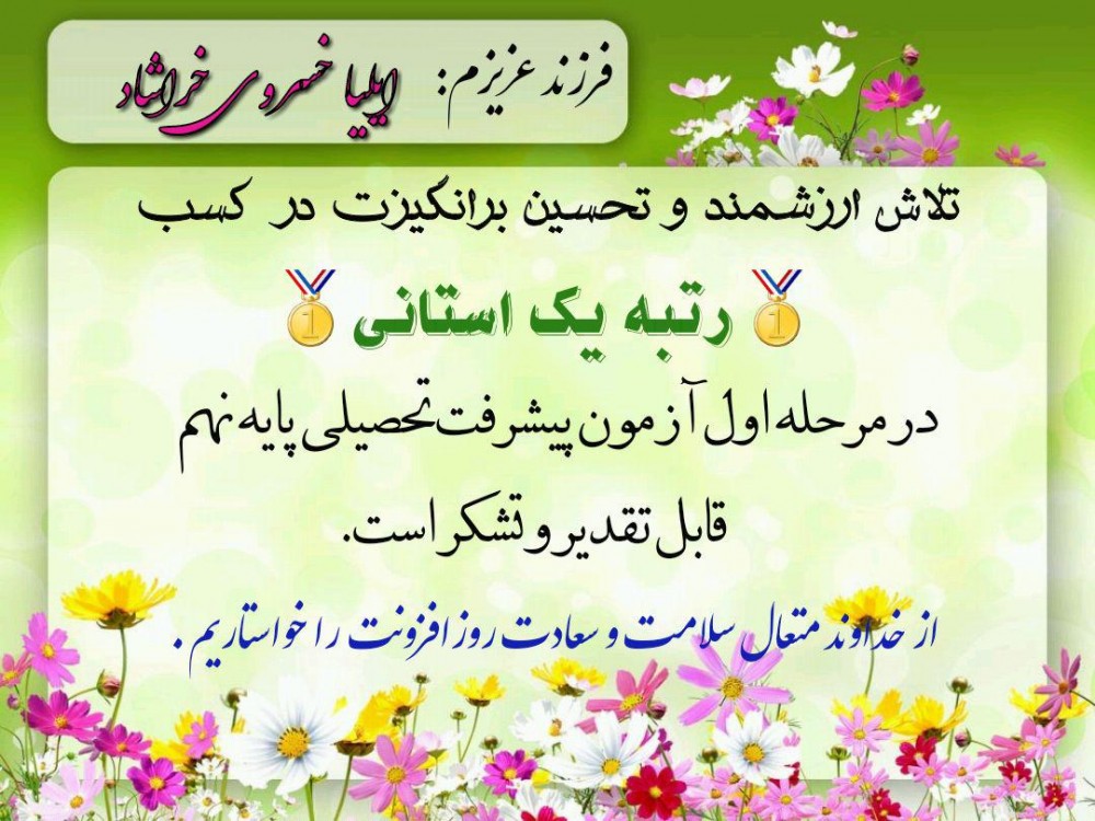 دانش آموز پایه نهم « ایلیا خسروی خراشاد » موفق شد در اولین مرحله آزمون پیشرفت تحصیلی «رتبه 1 استان» را با کسب نمره 100 درصد در تمامی دروس کسب کند.