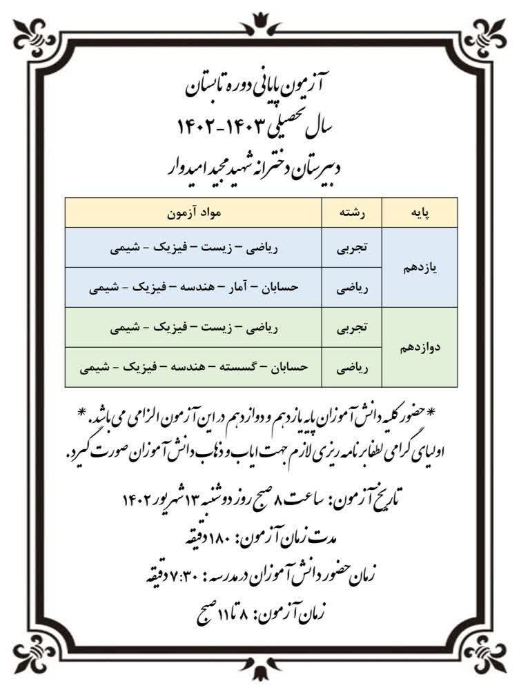 اطلاعیه آزمون پایانی کلاس های تابستانی سال تحصیلی 1403 - 1402