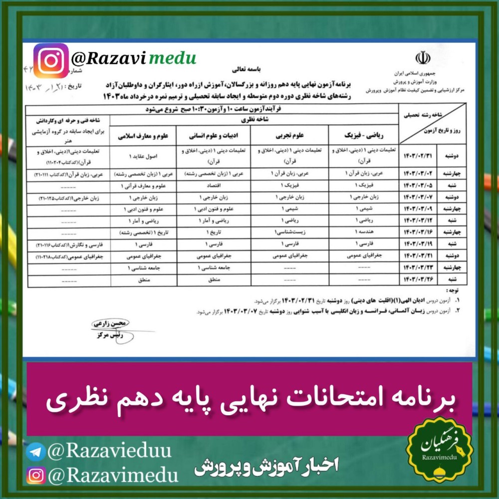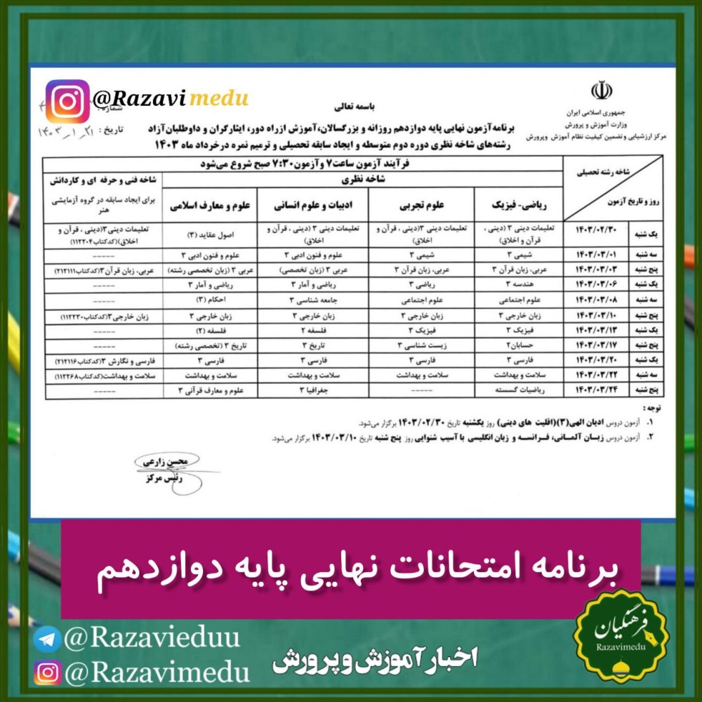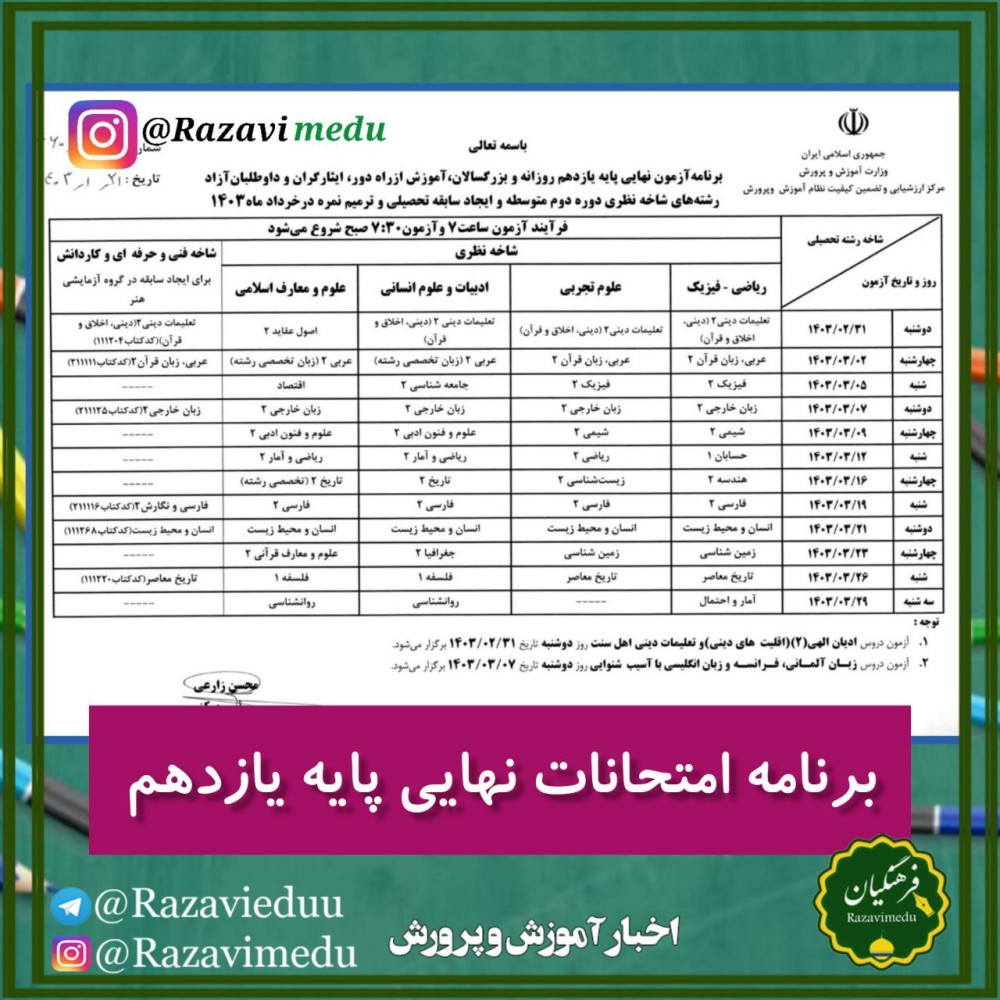 برنامه رسمی امتحانات نهایی پایههای دهم، یازدهم و دوازدهم